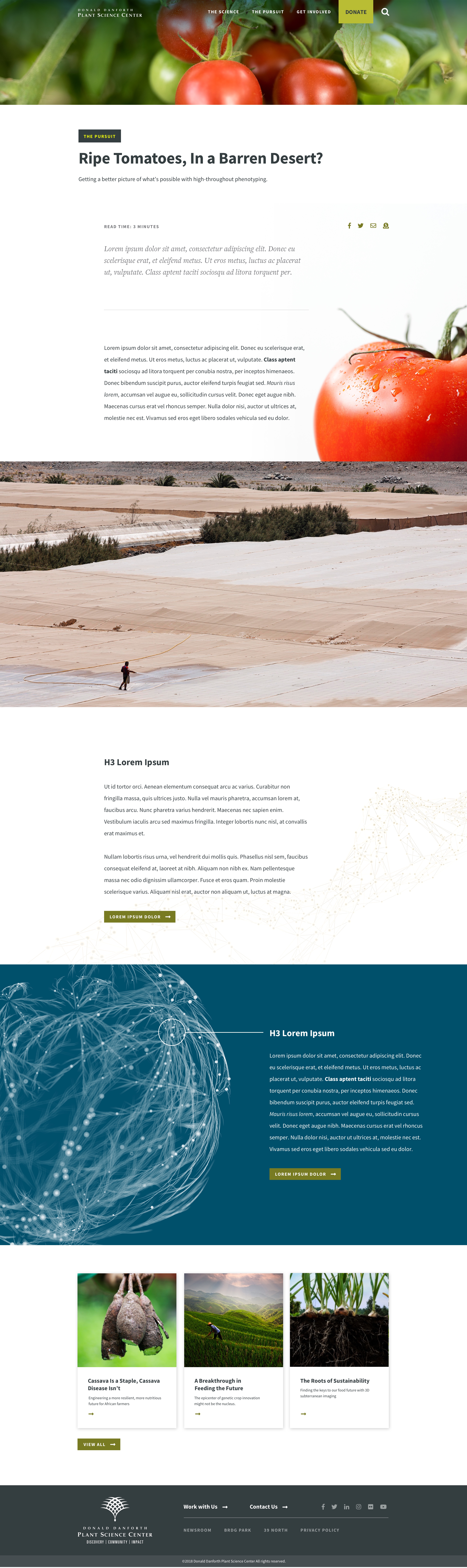 A NOTE ABOUT STYLE AND THE VISUAL LANGUAGE. As the most accessible, and often the most robust representation of your brand, a website should also be a shining example of the brand standards. Throughout the design process, however, we will make recommendations for web-specific fonts, composition, illustration or animation styles, video guidelines and color selections. As part of the deliverable, a working danforthcenter.org style guide will provide parameters against which other content owners and contributors can execute.